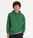 Soft cotton faced fabric. Brushed back fleece. Drop shoulder style. Double fabric hood with self colour drawcord. Front pouch pocket. Ribbed cuffs and hem.